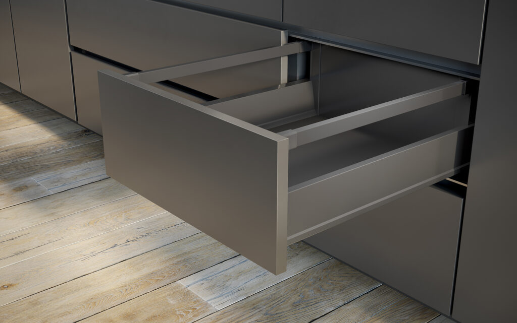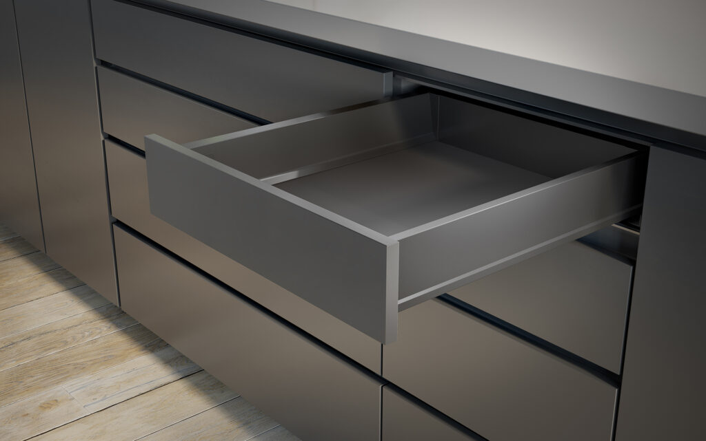 Przy wykańczaniu wnętrz wiele osób stawia przede wszystkim na funkcjonalność, jednak praktyczne meblarstwo nie zawsze jest stylowe. Innowacyjne rozwiązania GTV w kolorze antracytowym łączą wyszukany design z ergonomią mebli. Przykładem może być system Modern Box, czyli nowa jakość szuflad – optymalizujących organizację kuchni. Dzięki możliwości pełnego wysuwu szuflady, wytrzymałości na obciążenia do 40 kg i funkcji cichego domykania, system Modern Box zapewnia w kuchni porządek i intuicyjne zarządzanie przestrzenią. Płaszcz boczny w kolorze antracytowym dodaje szufladom subtelnego i modnego designu, pozwalając komponować się w kolorystykę korpusu mebla lub wyróżnić na tle jasnych frontów.