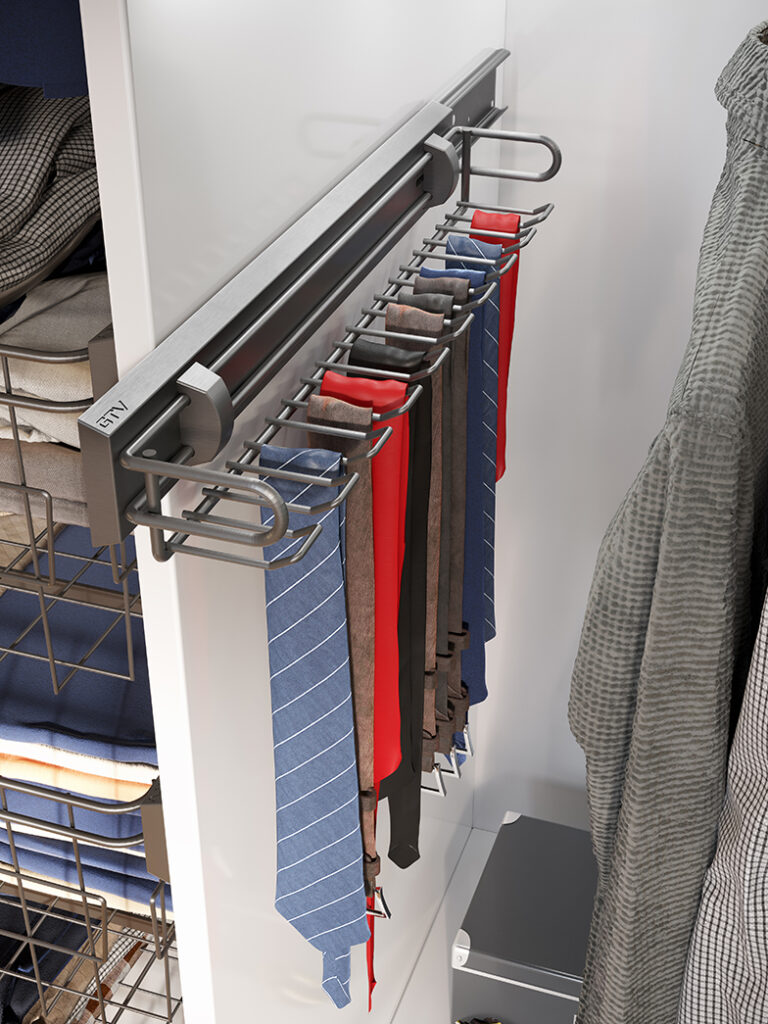Dostępne są także wieszaki do szafy przeznaczone na apaszki, krawaty czy torebki. Z kolei biżuterię, spinki do koszuli czy muszki najlepiej przechowywać w płytkich szufladach, wyposażonych w funkcjonalne przegródki.
