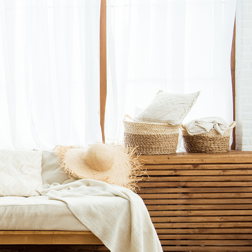 - dużo miękkich tkanin: puszyste zasłony, wełniane pledy, dziergany poszewek na poduszki.