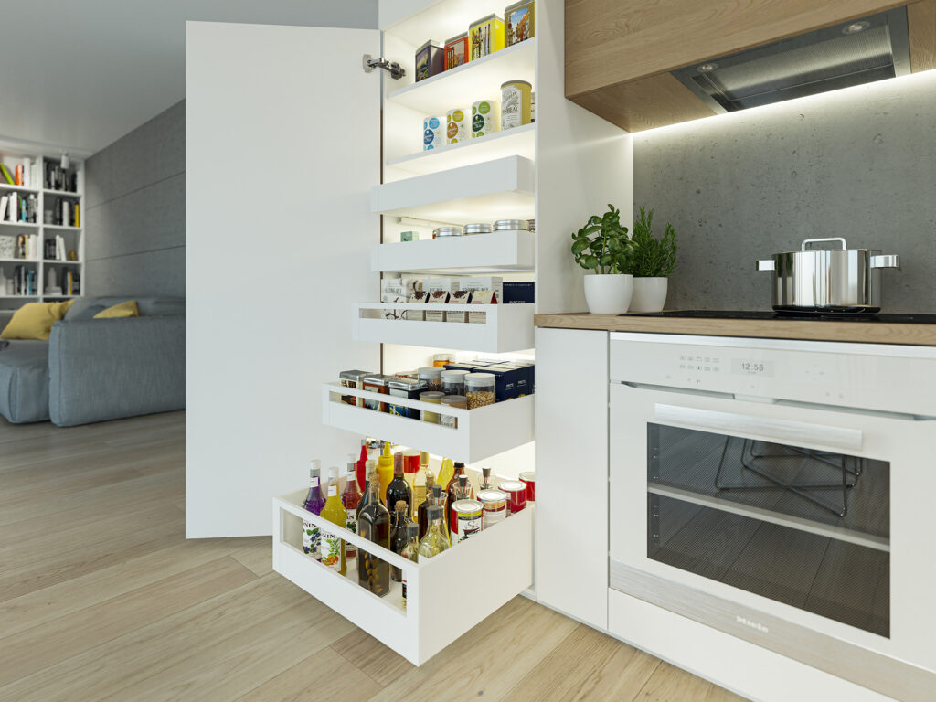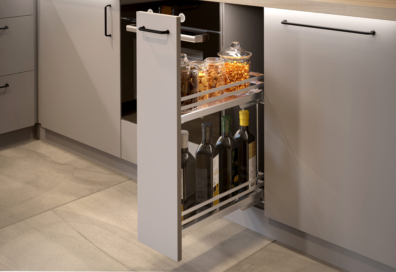 Akcesoria meblowe od GTV z serii Axis Pro zostały zaprojektowane w taki sposób, by sprostać różnorodnym potrzebom. System jest niezwykle uniwersalny – może posłużyć do budowy tradycyjnych, pojemnych szuflad poziomych, ale także stanowić bazę pod szuflady cargo. To drugie rozwiązanie jest niezwykle funkcjonalne. Pozwala maksymalnie wykorzystać przestrzeń nawet tam, gdzie jest jej niewiele. Wszystkie szuflady wchodzące w skład systemów Axis Pro i MovixPro zostały wyposażone w mechanizmy cichego domykania oraz możliwość pełnego wysunięcia – dzięki temu potrzebne akcesoria masz zawsze pod ręką.