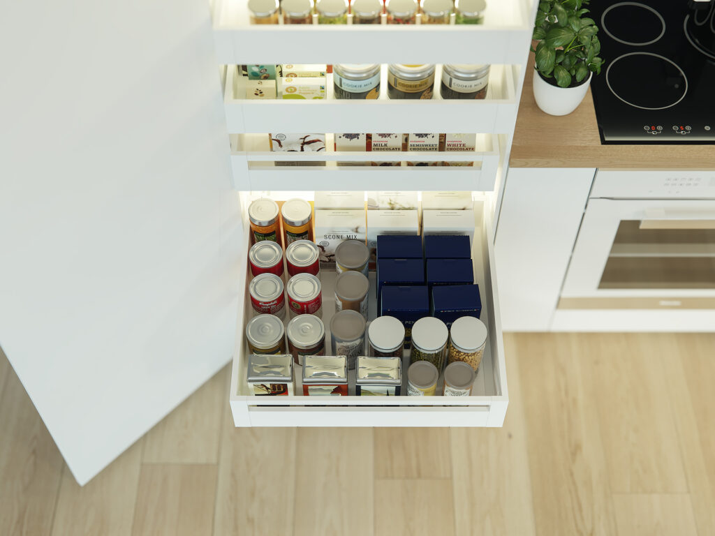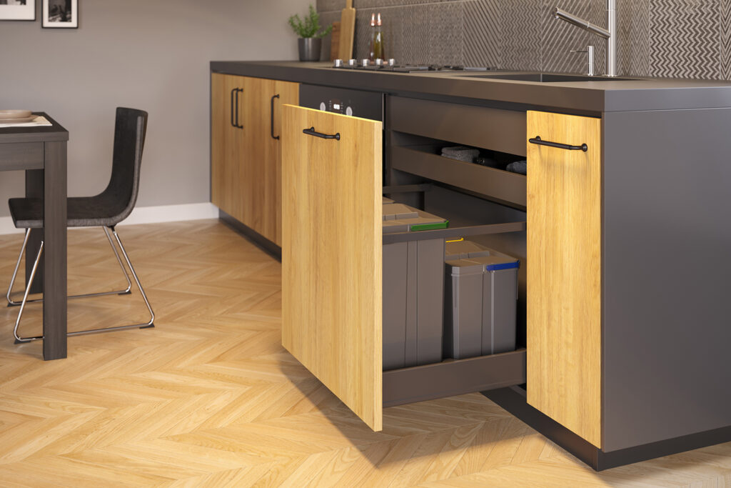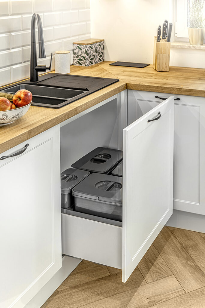 Ergonomiczne zaplanowanie układu szuflad to nie wszystko. Warto zadbać także o to, by w ich wnętrzu znalazły się udogodnienia, dzięki którym przechowywanie będzie jeszcze bardziej komfortowe. Tutaj także z pomocą przychodzą akcesoria meblowe od GTV. Jednym z ciekawych pomysłów są segregatory Multino New z mocowaniem. Jest to system koszy na śmieci przeznaczonych do segregacji. Możesz zamontować go w szufladzie, dzięki czemu zyskasz do niego wygodny dostęp, a przy tym zadbasz o estetykę – pojemniki na odpadki nie będą zajmować przestrzeni, wyglądając przy tym nieestetycznie ani zabierać cennego miejsca w szafkach.