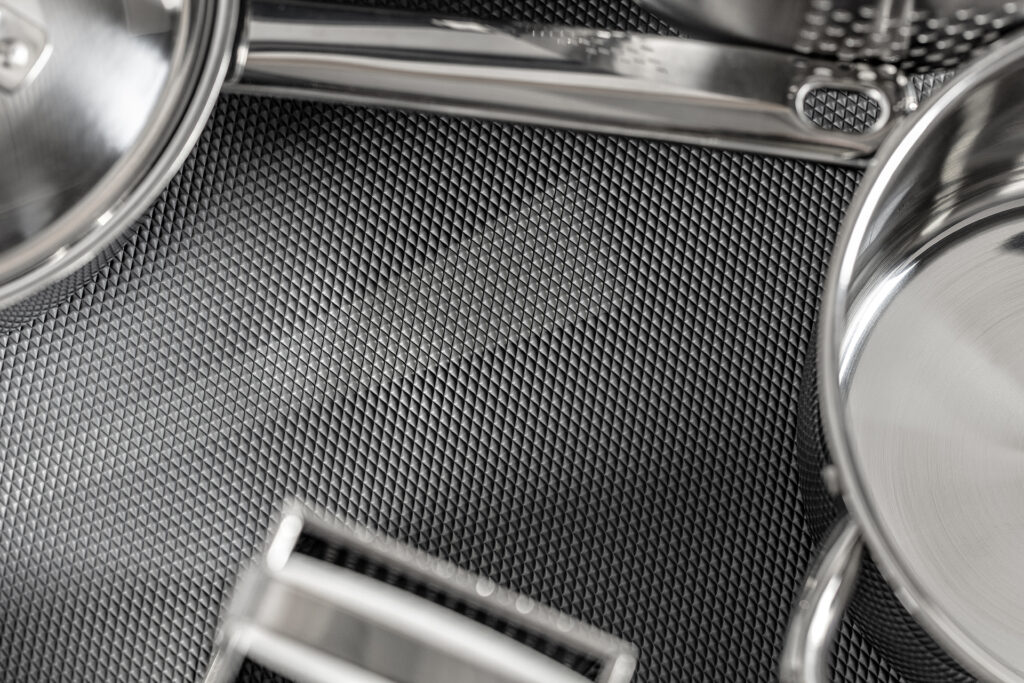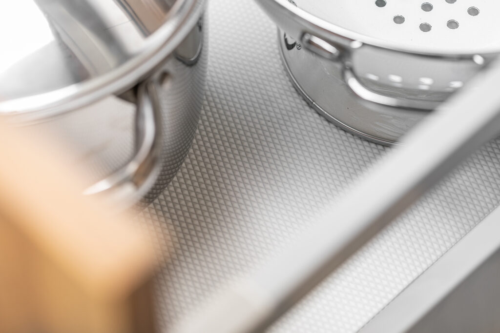 W szufladach przeznaczonych do przechowywania naczyń i sztućców sprawdzą się natomiast inne niezwykle funkcjonalne propozycje. Jedną z nich są maty antypoślizgowe z serii Axispace, które sprawiają, że każde akcesorium zostanie na swoim miejscu, nawet podczas energicznego wysuwania szuflady. Matę możesz dopasować do dowolnego rodzaju mebli. Jej kolejną zaletą jest to, że odkładanie naczyń na swoje miejsce nie będzie powodowało hałasu.