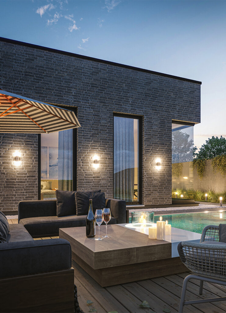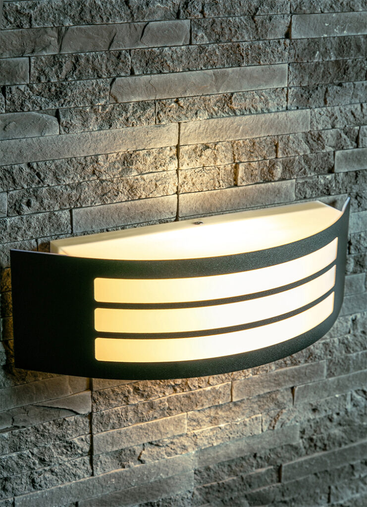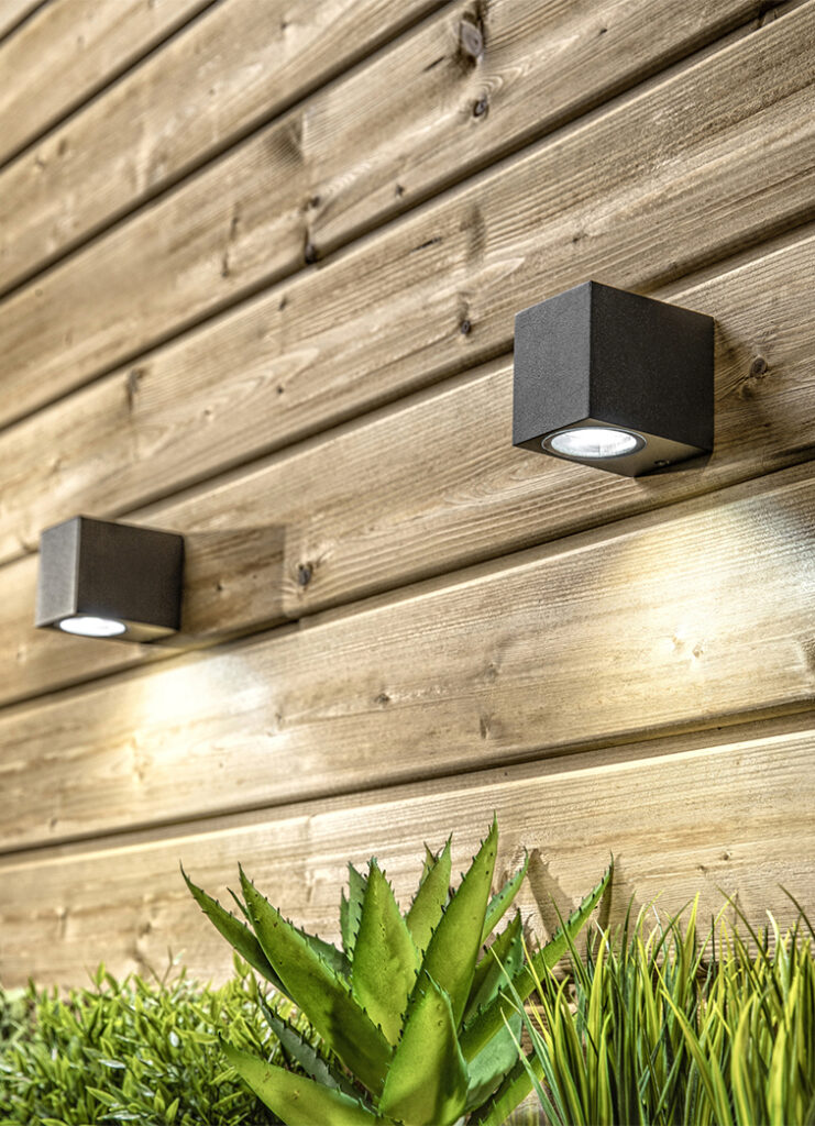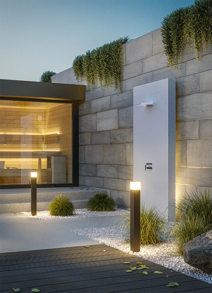 Osobom, które chciałyby uzupełnić oświetlenie ogrodu, podświetlając również dom, rekomendujemy oprawy ścienne takie jak Nessa czy Silva, plafoniery elewacyjne np. Astrit lub kinkietowe – Tiago. Po zmroku oświetlą budynek, a w ciągu dnia staną się niezwykle nowoczesną i designerską ozdobą domu.