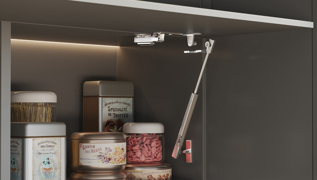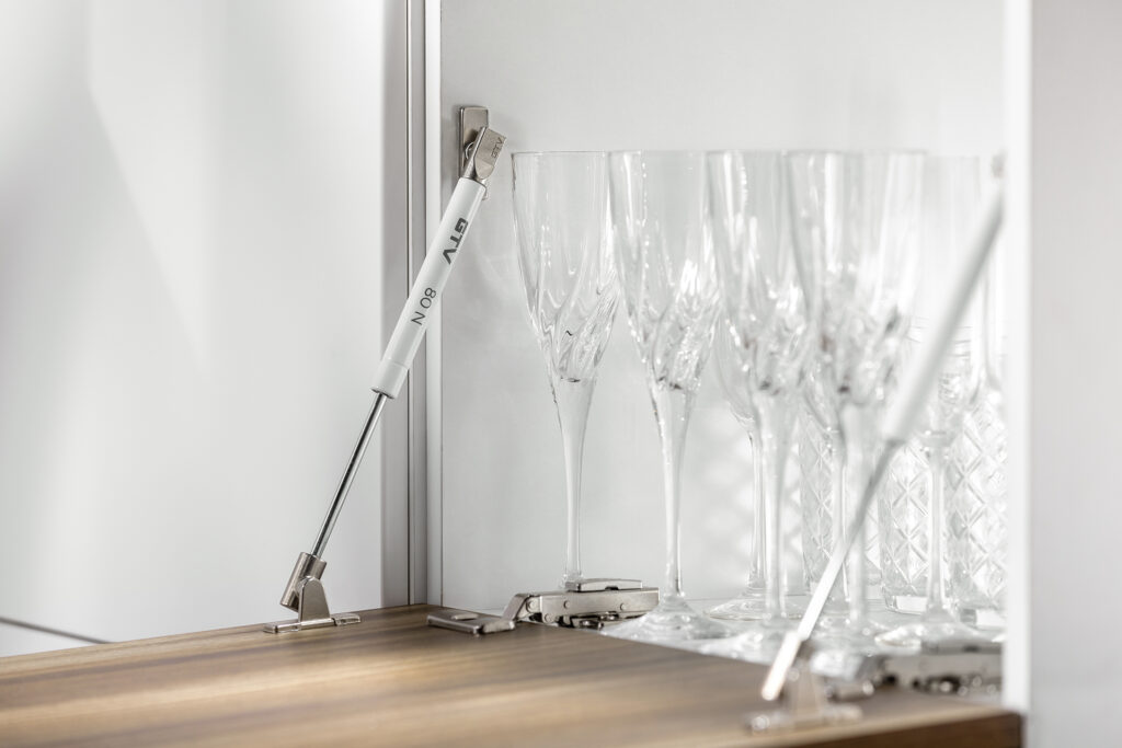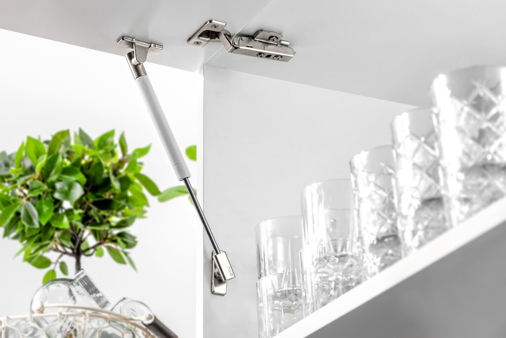 Warto wiedzieć, że teleskop gazowy nadaje się także do szafek otwieranych do dołu, jakie spotykamy często np. w domowych barkach. W celu równomiernego rozłożenia siły, w każdej szafce stosujemy dwa podnośniki – po obu stronach frontu. Niektóre siłowniki montuje się bezpośrednio do mocowania szafek, bez użycia narzędzi; inne wymagają dodatkowych elementów mocujących. Nie bez znaczenia jest również kolor podnośników, który powinien być dopasowany do frontów i wnętrza szafek: najczęściej wybierana jest biel, szarość lub ciemniejszy antracyt. Zastosowanie amortyzatora zapewnia z kolei tzw. cichy domyk podczas otwierania i zamykania szafek.